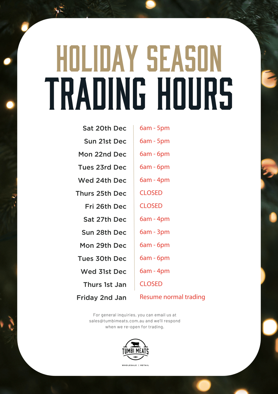 Tumbi Meats is now taking pre-orders for Christmas. All orders will be placed through our online shop as per normal. Please read through the below FAQs to ensure you’re aware of all changes!