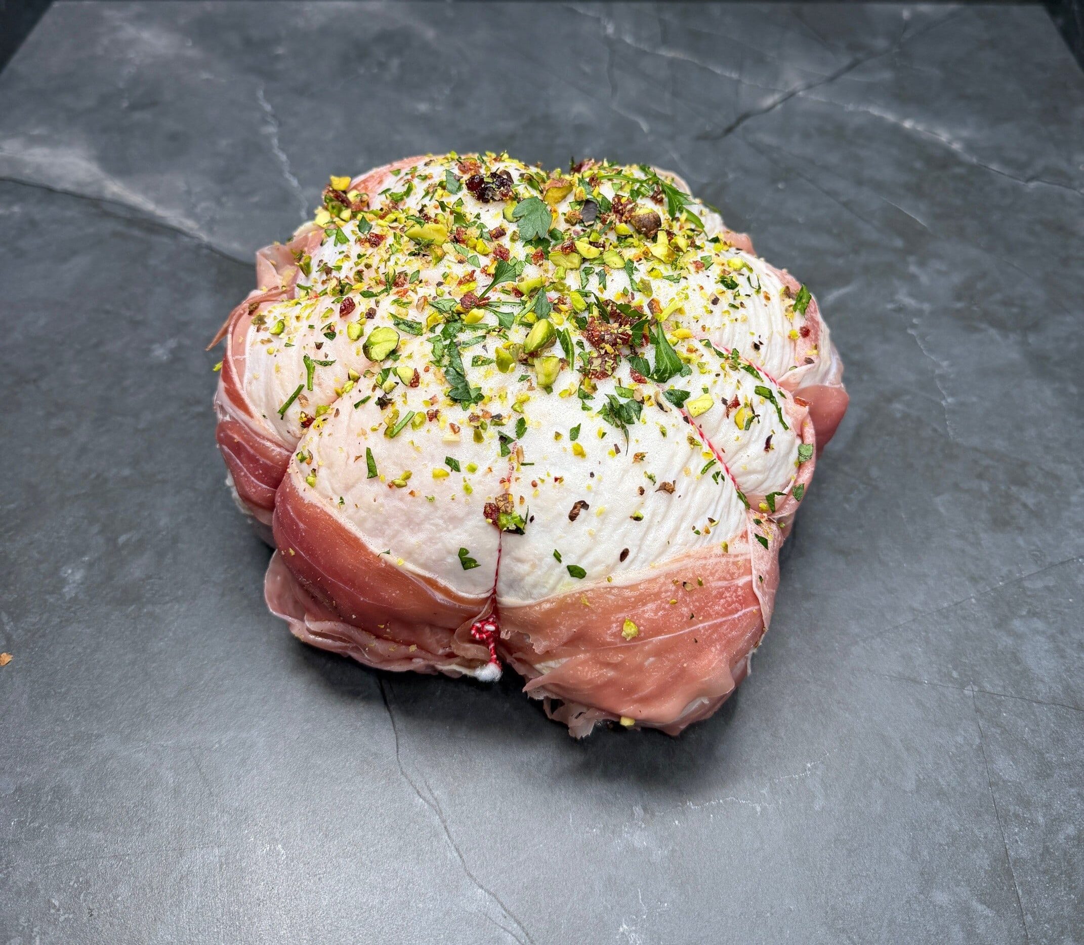 Turkey Breast wrapped in Prosciutto, Stuffed with Cranberry Apple and Pistachio.